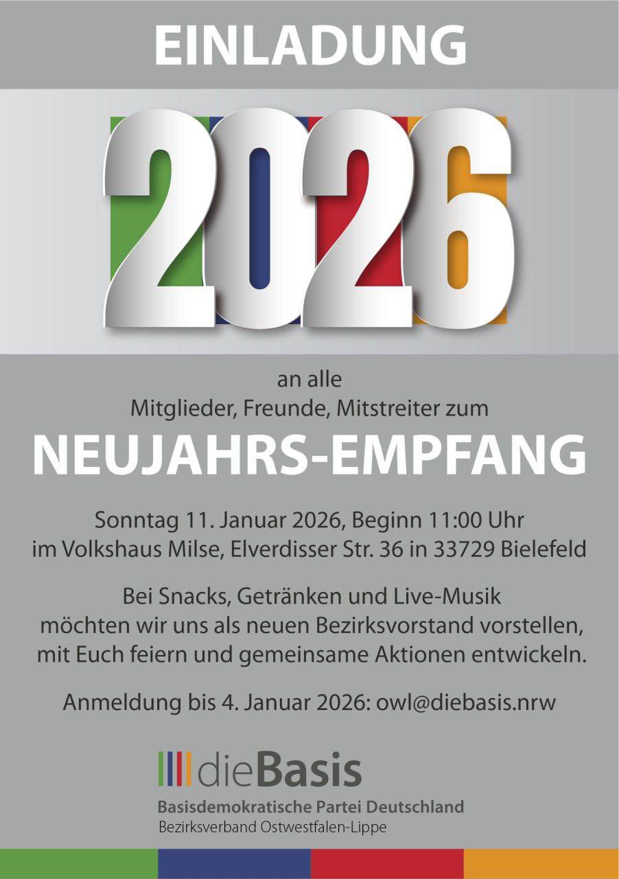 Am Sonntag, den 11. Januar, laden wir euch herzlich zu unserem Neujahrs-Empfang: 📍 Anmeldung bis 04.01.2026: owl@diebasis.nrw ⏰ Uhrzeit: ab 11:00 Uhr Bei Snacks, Getränken und Live-Musik möchten wir uns […]